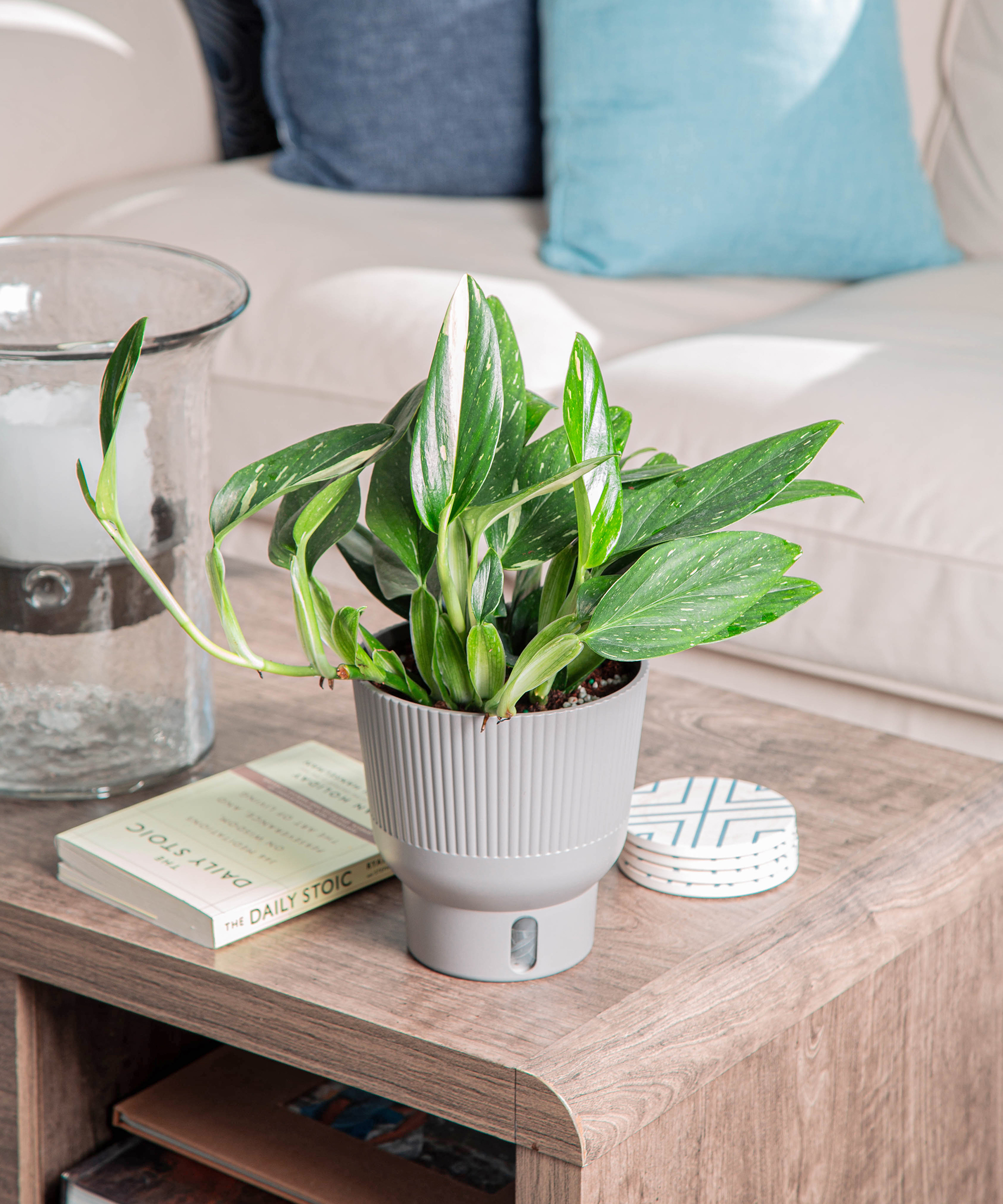 “This climbing houseplant offers variegated, bright-golden yellow leaves with added color from its pink stems and petioles,” says Justin. “With that bold color, you might think it’s exotic and hard to grow, but it’s surprisingly tolerant of forgotten waterings. (And if you grow it in a self-watering system, you don’t need to worry about watering!)”