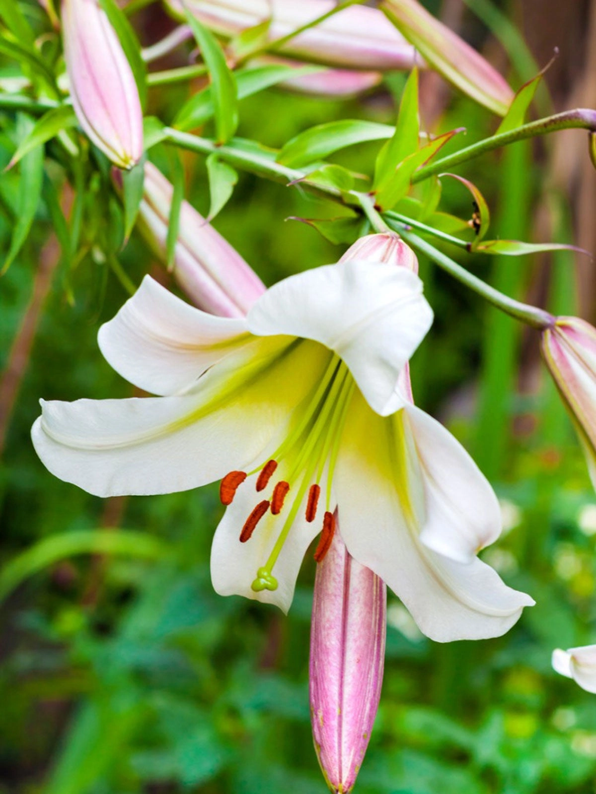 The flowers are white, trumpet shaped, and blush purple on the outside. The interior of the flowers is streaked with yellow. While the flowers of the regal lily are visually stunning, their sweet fragrance adds another element gardeners love. Plant clusters near a patio to enjoy the perfume of the regal lily on still summer nights.