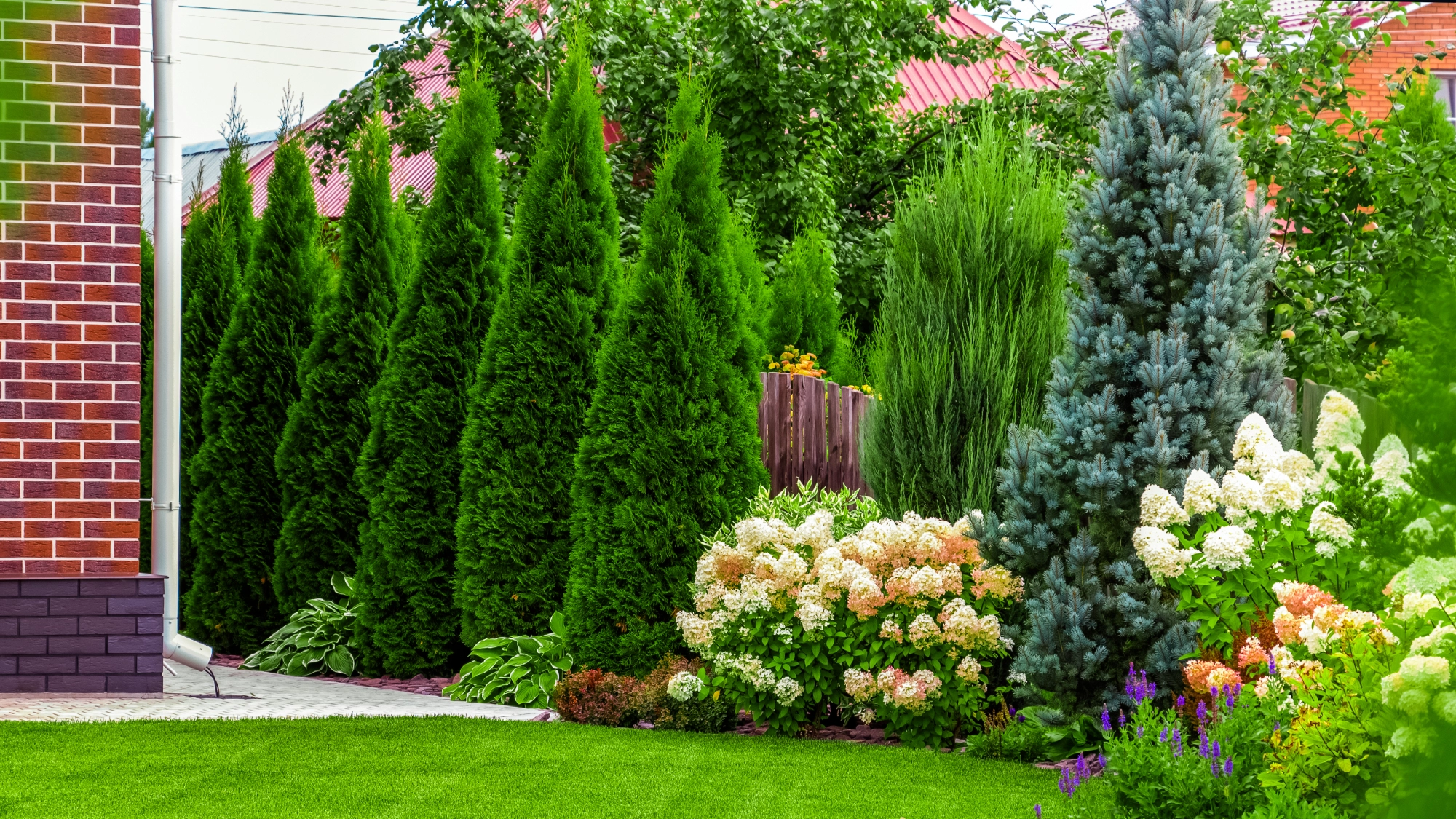 The sweet spot is fast-growing privacy trees that won’t get too big and take over your entire yard. Certain evergreens and columnar trees have a limit to their height or a slow enough growth rate that they don’t need constant fighting to keep them compact – but they’re not too slow to grow either.