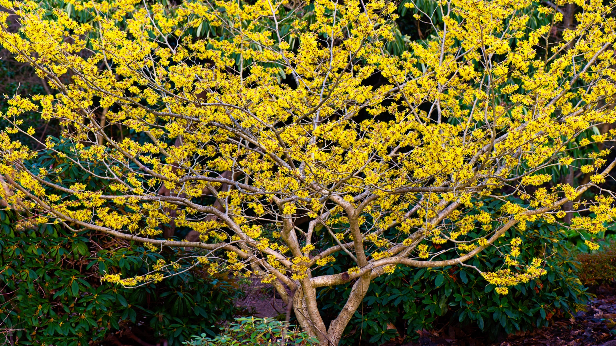 A larger plant than Ozark witch hazel, the American witch hazel has such a dense canopy that it works fell for a seasonal screen or hedge. The foliage turns canary yellow in autumn and flowers with strappy petals in a similar yellow light up a winter landscape.